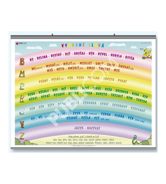 Slovenský jazyk - Vybrané slová - základné, tabuľa PVC 140 x 110 cm. Závesná graficky pútavá pomôcka navrhnutá tak, aby uľahčila učenie a zapamätávanie si vybraných slov žiakom 3. a 4. ročníkov ZŠ. Je vyhotovená v dvoch variantoch. Na dúhe sú vyobrazené základné vybrané slová tak, ako sú uvedené v učebnici slovenského jazyka pre 3. roč. ZŠ. Každá farba dúhy predstavuje skupinu základných vybraných slov po jednej spoluhláske (farby dúhy sú znázornené v poradí farieb farebného spektra). Pod dúhou sú uvedené slová, v ktorých píšeme y/ý po hláske „l“, aby si deti túto skupinu slov nezamieňali s vybranými slovami.