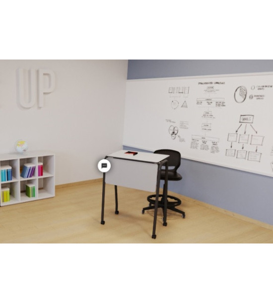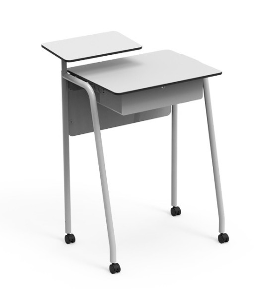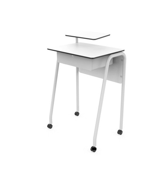 Učiteľský 1-miestny stôl, na prácu v stoji, výška 102,5 cm. Vrchná doska hrúbky 13mm. Vhodný pre kolaboratívne vyučovanie. Rozmery (dĺžka x šírka x výška): 70 x 55 x 102,5 cm.Všeobecné vlastnosti: Stoly majú konštrukciu z rúrky s priemerom 35x2 mm v obrátenom tvare „U“. Pod vrchnou doskou je odkladací priestor s bočnými stranami, spodnou a prednou hranou. - Vlastnosti stolovej dosky: vrchné drevovláknité dosky Compacmel® s vysokou hustotou vlákien a melanínovým povlakom majú VYSOKÚ MECHANICKÚ PEVNOSŤ a sú odolné voči vlhkosti. Vrchná doska je hrúbky 13mm, so zaoblenými rohmi. Farby dosky: svetlo šedá, biela. - Vlastnosti kovového rámu: náter epoxidovou živicou, farby: antracitová RAL 7021, šedá RAL 7035. - Nohy stola s kolieskami.Cena inštalácie a dopravy sa kalkuluje samostatne.