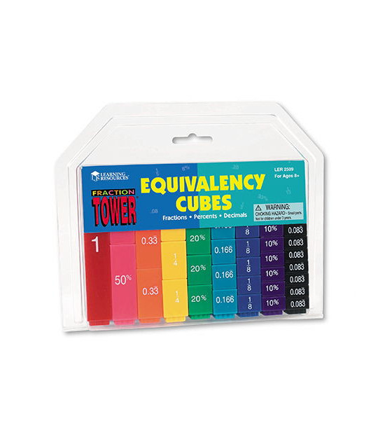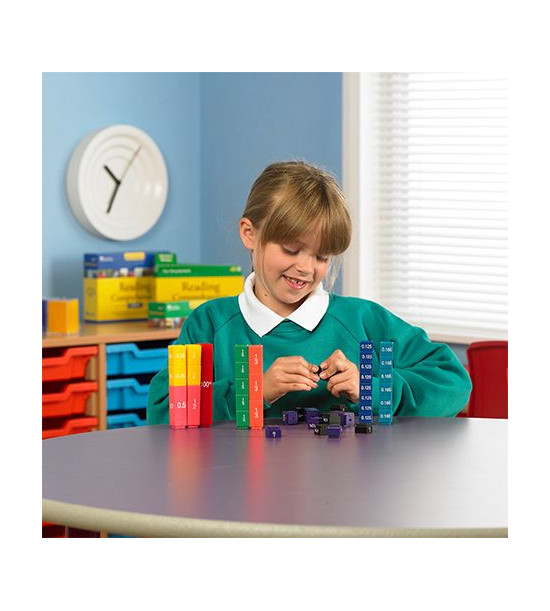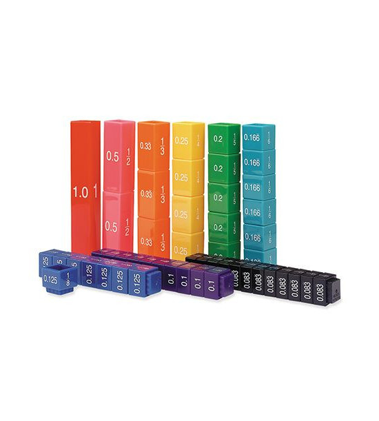 Pomôžte deťom vizualizovať a porozumieť zlomkom a prepočtom na desatinné čísla a percentá. Kocky s farebným rozlíšením pomáhajú deťom posilňovať prepojenia medzi ekvivalentnými množstvami v rôznych tvaroch. Kocky sú farebne odlíšené : červená = 1, ružová = 1/2, oranžová = 1/3, žltá = 1/4, zelená = 1/5, tyrkysová = 1/6, modrá = 1/8, purpurová = 1/10 a čierna = 1/12. Jedna celá časť meria 12 cm. Vhodné pre deti 6+