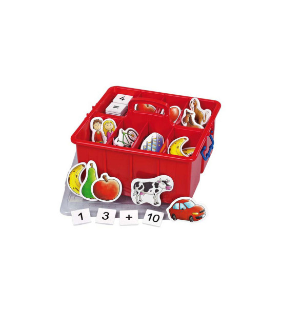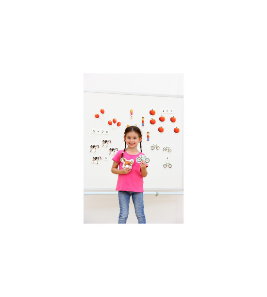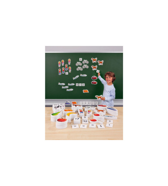 Názorná a praktická pomôcka so širokým využitím v aritmetike. Na sčítanie, odčítanie, násobenie, delenie, porovnávanie. Modelové riešenia slovných úloh. Praktické využitie relačných znakov.Obsah dodávky : 196 magnetických obrázkov v plastovom boxe s priehradkami: - 140 magnetických obrázkov / 13cm (vždy po 10: jablko, hruška, banán, krava, kôň, pes, mačka, balón, auto, bicykel, loď, lietadlo, dievča a chlapec). - 42 magnetických čísel / 5,3 x 5,3cm (2 sady: 0-20) - 14 matematických znamienok / 5,3 x 5,3cm (2 sady: +, -, ., :,< , > , =).