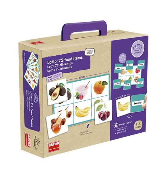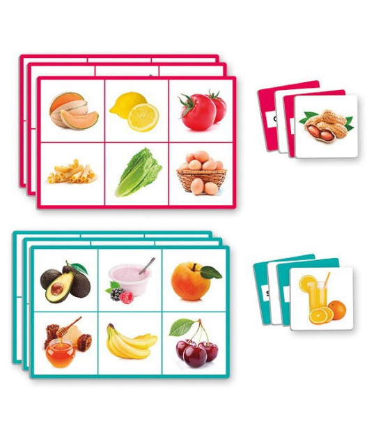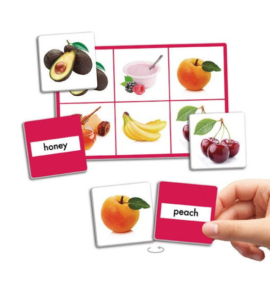 Na úvod je nevyhnutné, aby pedagóg zoznámil deti s potravinami na obrázkoch. Spoločne môžu na karty nalepiť vytlačené popisy. Hra má 2 herné varianty, prvým je priraďovanie obrázka k obrázku, druhým je priraďovane textového pomenovania k obrázku. Hru môže hrať až 12 detí súčasne v jednej skupine, alebo 6 detí v 2 skupinách. V tomto prípade sa karty rozdelia na dve polovice podľa farebného okraja. Každé dieťa si zoberie veľkú kartu. Malé karty sa položia na stôl obrázkom hore v prvom variante alebo popisom hore v druhom variante. Úlohou detí je nájsť v kope všetky obrázky, ktoré sú na jeho veľkej karte. Obsah: 72 obrázkových kartičiek (5,5 x 5,5cm), 12 veľkých kariet (18 x 12cm), samolepiace hárky. Kartičky so slovenským popisom, alebo s popisom v AJ či NJ sú k dispozícii na stiahnutie.
