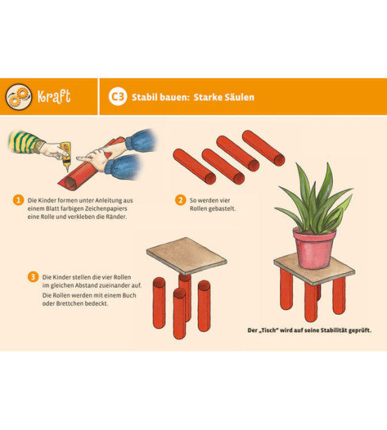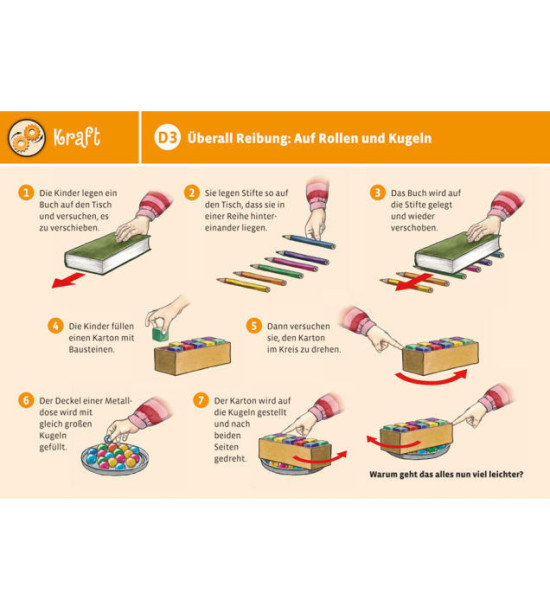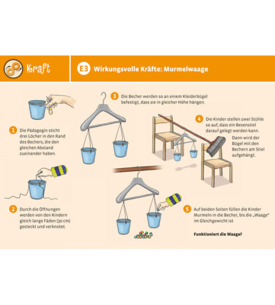 Číre a atraktívne zobrazenie jednotlivých skúšobných krokov na prednej strane karty zaisťuje jednoduché prevedenie experimentov. Poznámky na zadnej strane - prístup k vysvetleniu pre deti a vedú k reflexii a pochopenie pozorovaných javov. Viac kariet so stručnou informáciou o pozadí na pomoc učiteľom. Vek 4+.Obsah: 99 farebných kariet A5: 80 kariet s pokusmi rozdelenými do 8 častí životného prostredia (výkon / energie, vzduch, voda, svetlo / optika, teplo, zvuk, magnety, Príroda / materiály). 12 kariet s informáciami o vedeckom pozadí, 7 súhrnných kariet s úvodnou informáciu, plus zadarmo na stiahnutie 16 príbehov, ktoré slúžia ako predohra zo 16 pokusov a môžu sa deťom čítať.