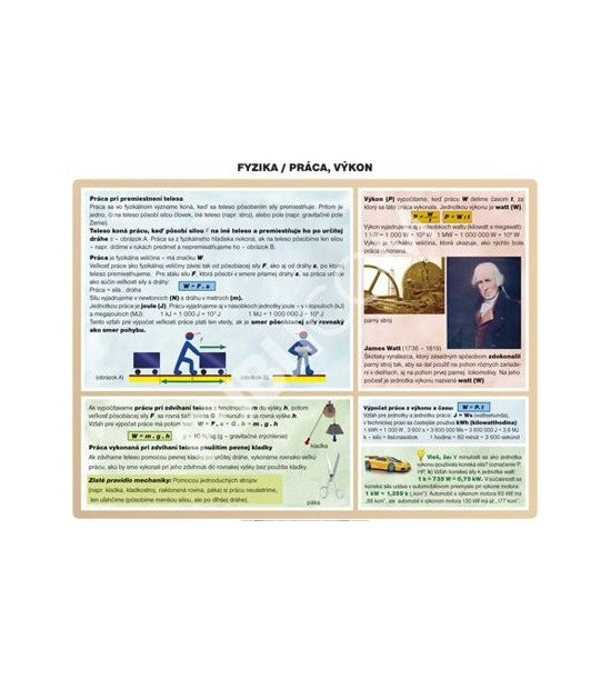 Fyzika - Práca, vykon, závesná tabuľa PVC 140 x 110 cm. Závesná tabuľa Práca, výkon rozoberá tému fyzikálneho učiva preberaného v 8. ročníku základnej školy. Teoretický výklad problematiky spracovaný textovo je vhodne doplnený obrázkami pre lepšie pochopenie učiva. Historické fakty (zdokonalenie parného stroja) sú prepojené so súčasnosťou (vývoj v automobilovom priemysle) nenásilnou a pre žiakov zaujímavou formou. Keďže téma výrobku vychádza z každodenného života a je s ním úzko spätá, sú použité obrázky predmetov každodennej potreby (nožnice, auto), s ktorými žiaci prichádzajú bežne do styku. Týmto je možné dosiahnuť u žiakov záujem o predmet a pochopiť jeho význam v praktickom živote. Výrobok je vhodný na trvalé vyvesenie nielen v odborných učebniach, ale i v triedach.