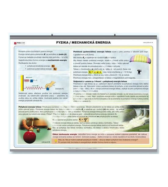 Fyzika - Mechanická energia, závesná tabuľa PVC 140 x 110 cm. Závesná tabuľa Mechanická energia nadväzuje nielen tematicky, ale i graficky na učivo spracované vo výrobku Práca, výkon. Spomínané témy sú preberané na hodinách fyziky v 8. ročníku základnej školy. Žiakovi je učivo prezentované formou prehľadného textu, vzorcov, ilustračných obrázkov i fotografií. Práve tieto poukazujú na fyzikálne zákonitosti a javy, s ktorými sa žiaci môžu stretnúť v každodennom živote. Cieľom prepojenia teórie s realitou je dosiahnuť u žiakov záujem o daný predmet a pochopiť jeho význam v praxi. Výrobok je vhodný na trvalé vyvesenie nielen v odborných učebniach, ale i v jednotlivých triedach.