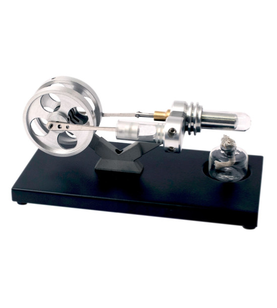 Stirlingov motor je piestový motor, v ktorom spaľovanie – na rozdiel od tradičného motora – prebieha mimo valca. Stirlingov motor premieňa tepelné rozdiely na mechanickú energiu, keďže horúci vzduch sa rozpína ??a studený vzduch sa sťahuje. Toto sa používa v uzavretom systéme, kde sa ten istý vzduch prečerpáva tam a späť medzi studenou a horúcou časťou motora. Stirlingov motor s pohyblivým piestom a so skleneným valcom, model používa ako palivo metylalkohol (liehový kahan). Motor je umiestnený na podstavci. Pri používaní motora nezabudnite použiť tepelne odolnú podložku a ochranné prostriedky. Rozmery: 18 x 9 x 9 cm. Hmotnosť 270g.