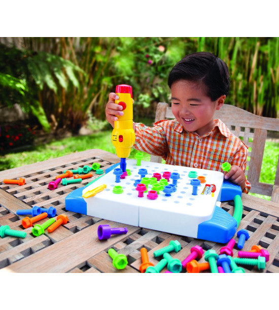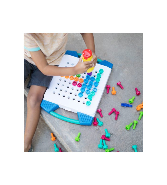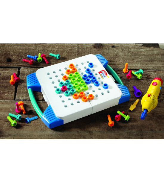 Prenosná sada s nástrojmi zahŕňa elektrický skrutkovač so spätnou funkciou, vymeniteľné vrtáky, 60 plastových skrutiek a príručku s 10 vzorovými obrázkami v pevnom kufríku, ktorý sa dá rozložiť. Skrutkovač obsahuje 3 x "AA" batérie, ktoré nie sú súčasťou balenia. Rozmer: 23x18cm. Vek 3+