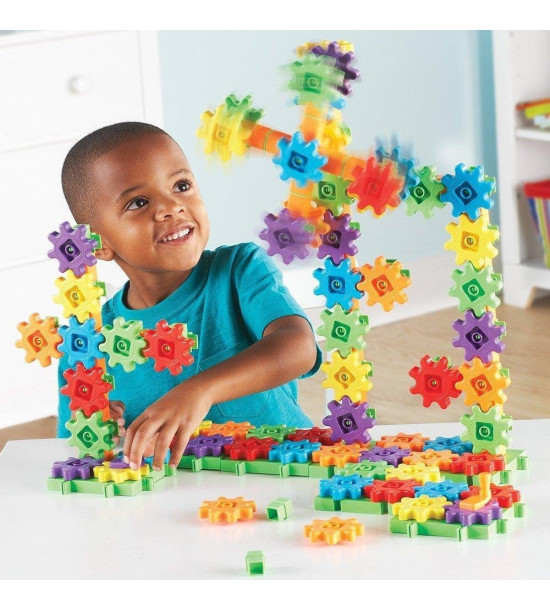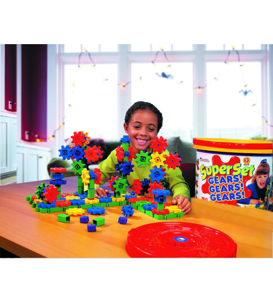 Sada pomáha rozvíjať jemnú motoriku. Deti skladajú ozubené kolieska a prevody, potom pozorujú ako sa celá stavebnica rozhýbe. Obsahuje ozubené kolieska, základné dosky a spoje, ktoré sú uložené vo vedierku, návod, spolu 150 ks. Obsahuje malé časti, nevhodné pre deti do 3 rokov.