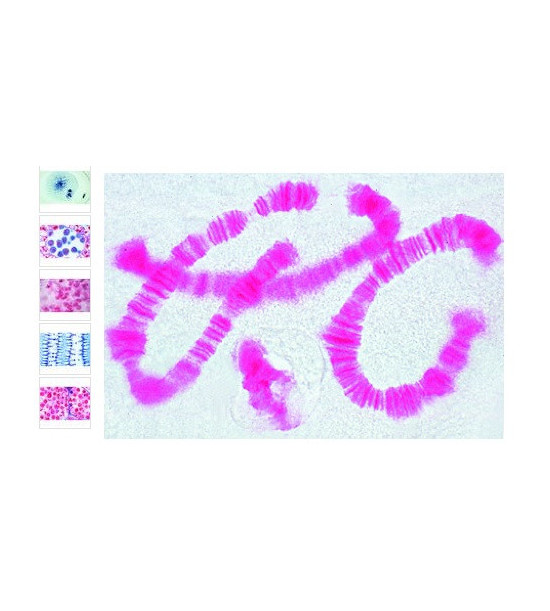 Sada 6 rôznych preparátov s popisom. Obsahuje tieto preparáty: 1. Bunkové delenie v špičke koreňa, cibuľa; 2. Bunkové delenie v kostnej dreni cicavcv; 3. Meióza a mitóza v semenníku salamandry; 4. Ľalia, peľové materské bunky, metafázy a anafázy; 5. Obrie chromozómy larvy pakomára, 6. Škrkavka - červ, embryológia. EN názvy: 1(d). Mitosis, l.s. from Allium root tips showing plant mitosis stained with iron-hematoxyline 2(f). Mitotic stages in sec. of red bone marrow 3(e). Meiotic and mitotic stages in sec. of Salamandra testis 4(f). Lilium, anther t.s., microspore mother cells showing telophase of first and prophase of second division 5(f). Giant chromosomes, smear from salivary gland of Chironomus 6(f). Ascaris megalocephala embryology. Sec. of uteri showing maturation stages.