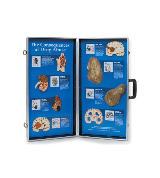 Podrobné tabule s modelmi, ktoré jasne ukazujú dôsledky užívania drog na naše orgány. Panely sú uložené v prenosnom kufríku. Rozmer po rozložení 71x68 cm.