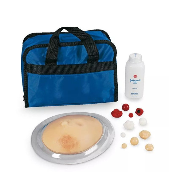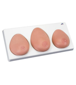 Model vyšetrenia prsníka. Mäkké, realistické simulované prsné tkanivo je umiestnené na pevný podklad s tvarovanými rebrami. Vymeniteľné hrčky a uzlíky rôznych veľkostí, tvarov a hustôt je možné umiestniť do prsníka v akejkoľvek kombinácii. Začervenaná oblasť peau d'orange na koži predstavuje karcinóm prsníka (IBC), sú to zmeny na pokožke, ktoré pripomínajú štruktúru pomarančovej kôry, konkrétne zhrubnutie a tvorbu jamiek, môžu signalizovať zápalový karcinóm prsníka. Návod na vyšetrenie jedného prsníka obsahuje štyri mäkké uzlíky vo farbe kože, ktoré predstavujú normálne tkanivo; tri stredné biele hrčky a štyri tvrdé (červené) hrčky vrátane nádoru s pevnou stenou. Hrčky a uzlíky sa líšia veľkosťou od 1 do 3 cm, sú okrúhle a nepravidelného tvaru a predstavujú cysty aj malígne,zhubné nádory. Súčasťou balenia je aj púder, pozdro na prenášanie a návod na použitie.Hmotnosť 1,3 kg.