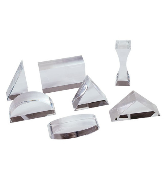 Súpravu 7 optických modelov tvoria šošovky a hranoly. Umožňujú študovať odraz a lom svetla. Sú vyrobené z bezchybného akrylátového skla. Obsah: 7ks (najmenší model: 23 x 38mm; najväčší model: 23 x 75mm). LED - projektor a príklad z obrázku nie sú súčasťou.
