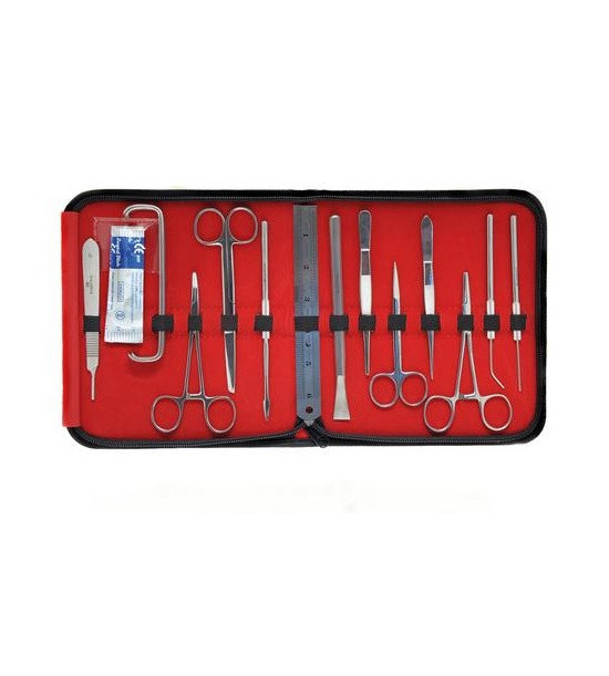 Set obsahuje 14 kusov nástrojov na prípravu mikroskopických preparátov - dodávané v obale. Balenie obsahuje: kovové pravítko 15cm, lancetu 15cm, pinzety, peány, preparačné ihly (rovnú a zahnutú), skalpelový držiak č. 3, čepielky č. 10, chirurgické nožnice, kliešte, retraktor Farabeuf 12cm, preparačnú špachtľu 16cm.