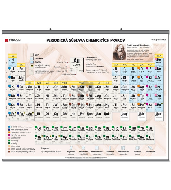 Chémia - Periodická sústava prvkov PSP - II. vydanie, tabuľa PVC 140 x 110 cm. Tabuľa „Periodická sústava chemických prvkov" je určená pre žiakov druhého stupňa základných škôl a osemročných gymnázií ako učebná pomôcka pri výučbe na hodinách chémie. abuľa ponúka všetky základné informácie o v súčasnosti známych chemických prvkoch – protónové číslo, teplotu topenia a varu, typ kryštálovej sústavy, hustotu, oxidačné číslo, značku a slovenský názov prvku. Farebné rozlíšenie rozdeľuje prvky na kovy, polokovy a nekovy, farebné označenie delí jednotlivé prvky na alkalické kovy, kovy alkalických zemín, chalkogény, halogény, vzácne plyny, lantanoidy, aktinoidy, triádu železa, triádu ľahkých platinových kovov a triádu ťažkých platinových kovov. Výrobok dopĺňajú základné informácie o ruskom chemikovi D. I. Mendelejevovi – autorovi prvej verzie periodickej sústavy chemických prvkov. Rozmer tabuľa PVC 140 x 110cm.