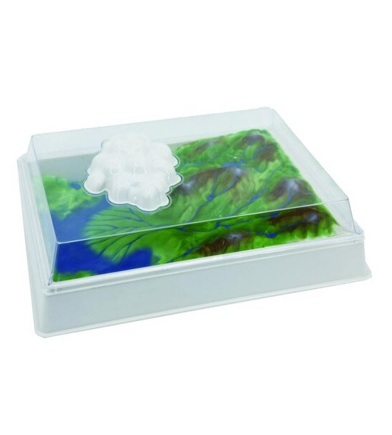 Kolobeh vody - simulátor. Tento model demonštrujte kolobeh vody v prírode. Model, pozostávajúci z plastovej nádrže, do ktorej je vložená zvažujúca sa krajina s horami, údoliami, pobrežím a morom. Vrchnák s imitáciou mraku, kde vložíte kocky ľadu. S lampou, ktorá simuluje slnko (odporúčame IR lampu) a ktorá svieti cez hornú časť vrchnáku, sa vodná plocha ohrieva. Následne vodná para kondenzuje v chladnej oblasti pod kockami ľadu, vytvára dážď, ktorý padá na hory a steká do opäť do mora.Rozmery: (V x Š x D) 12 x 35 x 45 cm. Lampa nie je súčasť dodávky!