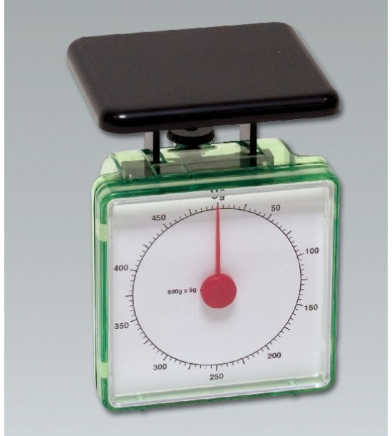 Pružinové váhy v priehľadnom plastovom puzdre s jasne viditeľným mechanizmom váženia, vážiacou doskou, nastavovacou skrutkou pre kompenzáciu tary a okrúhlou stupnicou. Rozsah váženia 0 až 500; rozlíšenie 5g. Vážiaca doska: 80 x 70mm. Rozmery: 80 x 65 x 110mm; hmotnosť 110g.