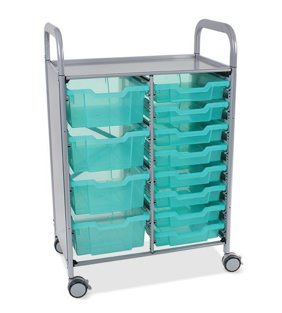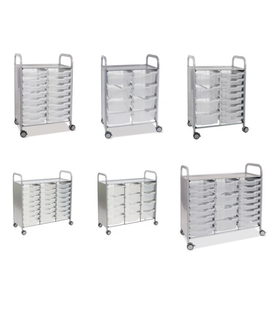 Mobilný vozík, pracovisko pre študentov (horná pracovná plocha) a úložný priestor pre materiál a pomôcky do kontajnerov. Vozík na kolieskach je vyrobený z ľahkej ocele bez ostrých hrán, je bezpečný a ľahko sa s ním manévruje, čo poskytuje maximálnu flexibilitu. Vozík aj boxy sú ošetrené antibakteriálnou technológiou BioCote® (pre vyššiu hygienu sú povrchy ošetrené vrstvou striebra vo forme strieborných iónov na zabránenie rastu mikroorganizmov). Povrchy sa už nemusia neustále umývať, aby sa zabránilo infekcii. Ideálne vybavenie aj pre zdravotné školy, lekárske univerzity a zdravotnícke zariadenia. Rozmery 885 (1055mm s držadlami) x 690 x 430 mm. Počet a farbu (kivi a priehľadná) kontajnerov F1 a F2 je možné kombinovať podľa požiadaviek. Vozík je dostupný aj vo verzii s 3 oddielmi kontajnerov rôznych veľkostí.