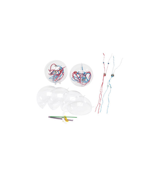 Sada DNA - chromozómy je veľmi poučná. Znázorňuje DNA v rôznych fázach bunkového života a uľahčuje pochopenie mechanizmov mitózy a meiózy. Možnosť demonštrovať: genetickú informáciu, DNA a chromozómy, správanie chromozómov počas mitózy, možnosť demonštrovania rôznych javov na modeli. Cieľom je vysvetliť čo najjednoduchším a najkonkrétnejším spôsobom prenos genetických informácií a pôvod rozmanitosti ľudských bytostí.Sada obsahuje: - 4 gule z transparentného plexiskla (priemer 120mm), - 2 sady zložené z 2 modrých a 2 červených ohybných drôtikov, koráliky zastupujúce materské/otcovské molekuly DNA a 2 modré šnúrky na modeláciu chromozómu Y;..., - 50 farebných kúskov pripnuteľných na drôtiky reprezentujúcich alely.