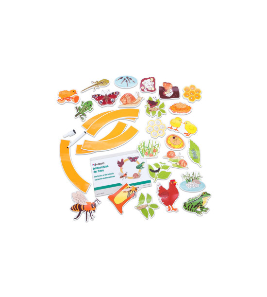 Ako vlastne z vajíčka vznikne kuriatko alebo žabka? S touto rozsiahlou sadou spoznajú vaše deti životný cyklus sliepky, žaby, slimáka, včielky a motýľa. Vďaka prehľadnému podaniu je materiál ľahko pochopiteľný a rýchlo tak zaistí "aha efekt".Magnetické obrízky sú využiteľné na akomkoľvek magnetickom povrchu, napr. na bielej magnetickej tabuli, alebo na kovovom paneli. Žlté magnety učiteľ spojí do kruhu. Pomocou šípok po obvode definujete sled vývinutakže je hneď vidno, kam treba umiestniť nasledujúce vývinové štádium. Ak sú všetky obrázky umiestnené v kruhu správne, je jasne znázornený životný cyklus príslušného živočícha. Je možné vytvoriť rôzne stupne obtiažnosti: 1. Pomiešajte poradie 5 obrázkov iba v rámci jedného životného cyklu. 2. Pomiešajte všetky obrázky, aby deti najprv mulesli vyhľadať správne obrázky živočícha, ktorého vývin chcú znázorniť.Rozsah dodávky: po 5 magnetov s obrázkami vývinových štádií sliepky, žaby, slimáka, včely, motýľa (spolu 25 magnetických obrázkov); 5 magnetov na označenie alebo číslovanie jednotlivých krokov cyklu (možno ich popisovať fixkami na tabule). Fixka nie je súčasťou dodávky.