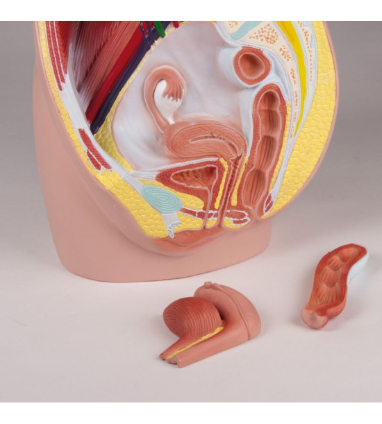 Tento model v životnej veľkosti je stredovo sagitálne rozdelený a zobrazuje ženskú panvu v 3 častiach. Okrem svalov a ciev brucha zobrazuje najmä urogenitálne orgány. Odnímateľné časti sú: polovica maternice, vagína a močový mechúr a polovica čreva s konečníkom. Rozmer 22 x 20 x 25 cm, hmotnosť 1 kg.