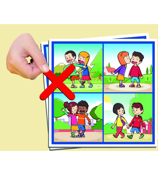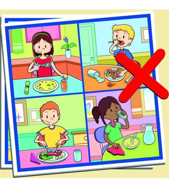 Preskúmajte kartičky a vyberte pozitívny prístup. Objavte 48 typov správania. Prezrite si 4 obrázky a prečiarknite nevhodné správanie. Hra podporuje výuku hodnôt. Obsahuje 12 kariet so 4 obrazkami, 12 krížikov, pedagogický návod a samokontrolný opravný systém.