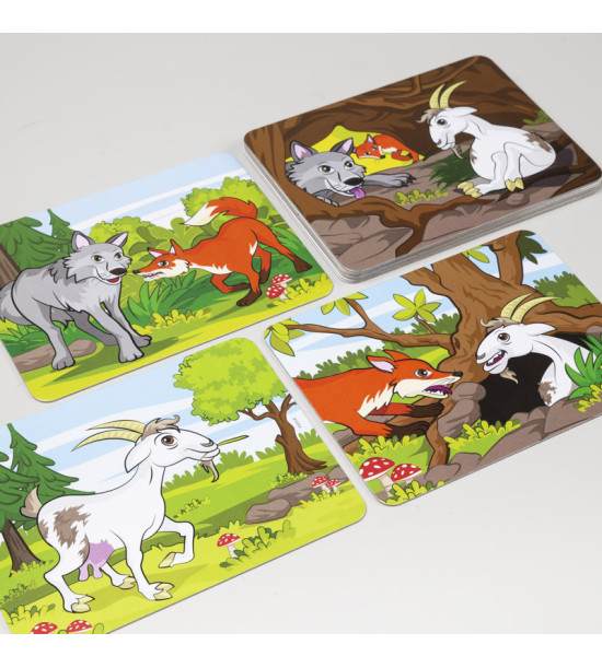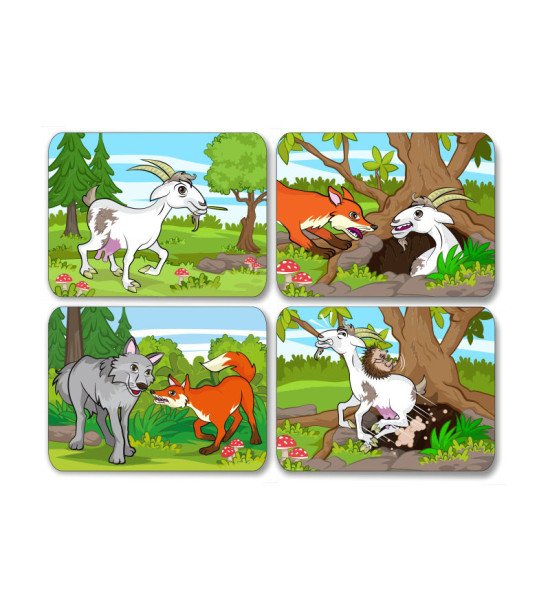 Súbor magnetických obrázkov pomáha vizuálne vnímať počúvaný text, reprodukovať a usporiadavať dej podľa dejovej a časovej postupnosti, rozvíjať slovnú zásobu. Materiál: obrázky z pevného kartónu hrúbky 2 mm s magnetom.