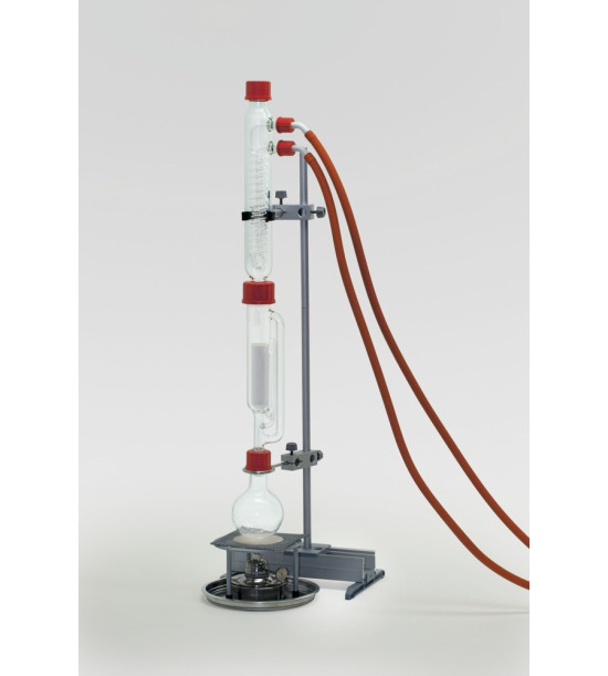 Pomocou Extrakčného setu si môžu študenti vyskúšať izoláciu málo rozpustných materiálov. Špeciálna konštrukcia Soxhlet - extractor funguje na princípe rozpúšťania v extrakčnom rozpúšťadle. Čistý roztok sa transportuje do oddeľovacieho prstenca a takto sú málo rozpustné komponenty oddelené a obohatené o roztok. SVS systém je založený výlučne na skrutkových spojoch obsahujúcich skrutkový uzáver, silikónové tesnenie a PTFE manžetu. To všetko zabezpečuje oveľa jednoduchšie ovládanie a zaistí bezpečnosť a odolnosť voči priesaku spojmi medzi jednotlivými časťami. Skladované s výstužou a krytom. Obsahuje: banku 100ml; Soxhlet separátor; Dimroth chladič 210mm; extrakčný prstenec 5x; stojan; svorku 2x; tyč stojana 330mm 2x; svorkový držiak 2x; upevňovací krúžok, trojnožku; držiace svorky; keramickú drôtenú sieťku; kahan a ohňuvzdornú podložku; kadičku 100ml; gumenné rúrky. Materiál pre jednu skupinu študentov.