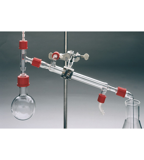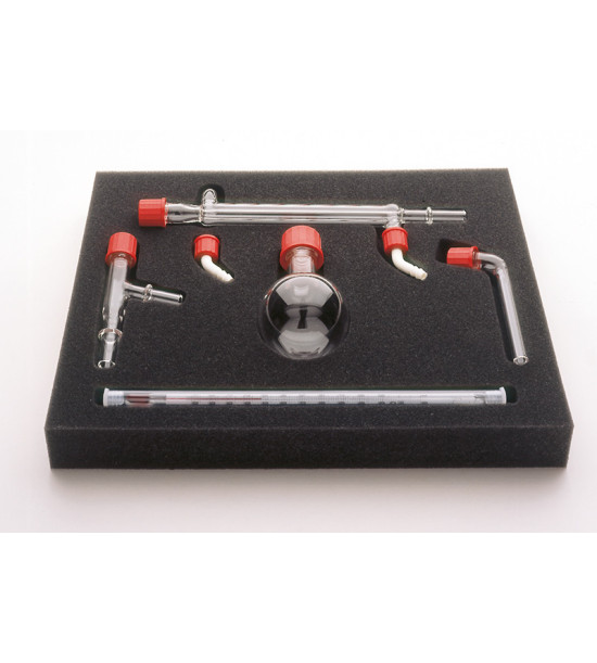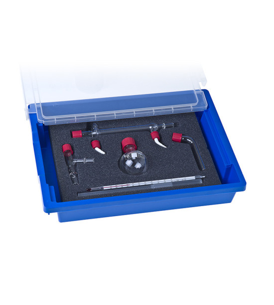 Súprava laboratórneho skla na zostavenie destilačnej súpravy. Bez statívovej súpravy. Pomocou tohoto setu sa dajú bezpečne vykonať všetky obvykle prevádzané destilačné procesy. Študenti môžu sledovať chladenie vody a oddeľovanie kvapalín na základe ich odlišných teplôt varu. Časti súpravy sú bezpečne uložené v penovej vložke. Na transport a uskladnenie odporúčame doobjednať plastový box s vekom.