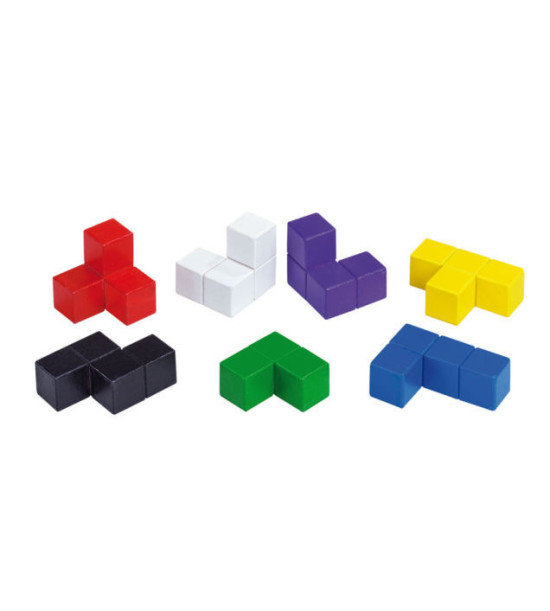 Táto drevená kocka tvorí priestorové puzzle. 7 samostatných farebných častí je možné spojiť do jedného celku o veľkosti 9 x 9 x 9cm. Jednotlivé diely môžu byť použité na vytvorenie rôznych priestorových 3D tvarov. Pracovné karty je možné dokúpiť samostatne.