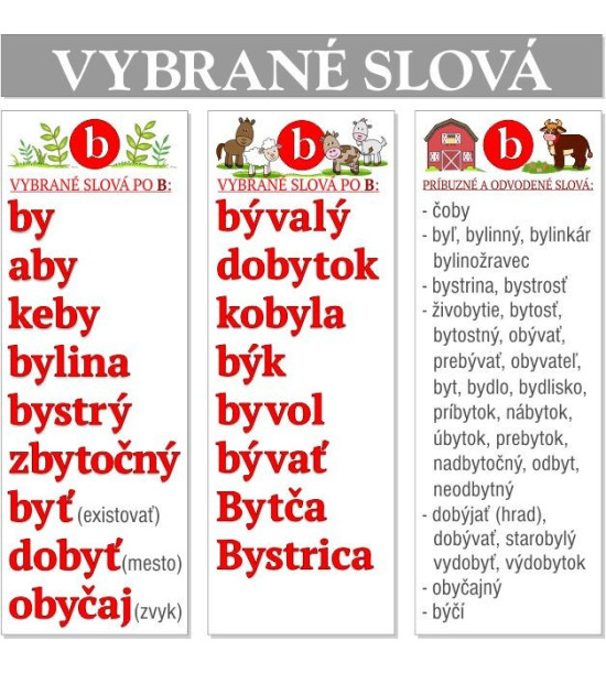 Nová verzia kartónových obrazov na výučbu vybraných slov. Základné vybrané slová sú doplnené aj o slová príbuzné a odvodené . Praktická učebná pomôcka s celoročným využitím na stenu alebo magnetickú tabuľu.