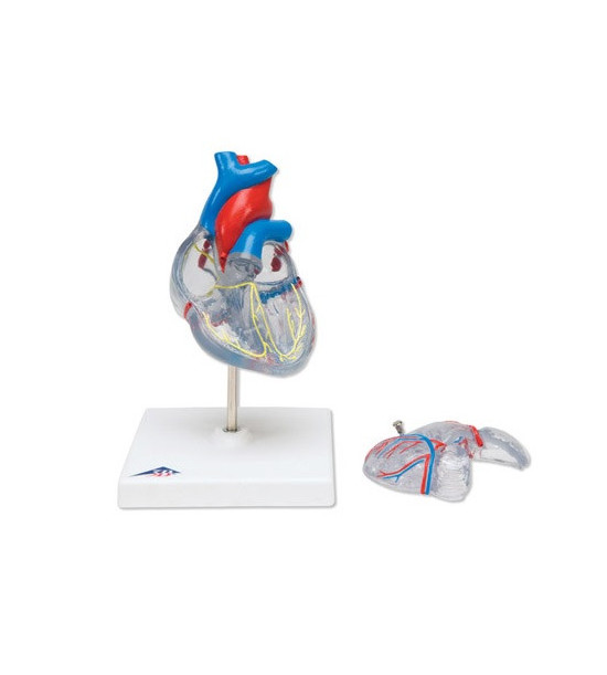 Detailné transparentné dvojdielne srdce. Predná srdcová stena je vyberateľná na odhalenie komôr a chlopní vo vnútri. Kompletný obehový systém ľudského srdca je zobrazený farebne. Srdce je dodávané na stojane. Rozmery: 19x12x12 cm.