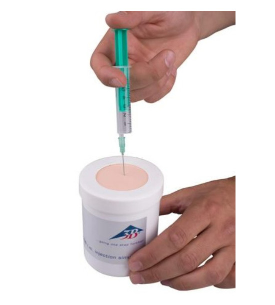 Základná verzia na precvičovanie intramuskulárnych injekcií.Študenti si môžu precvičiť zavedenie injekcie s tekutinou až do hĺbky 50 mm. Rýchlo vymeniteľné kožné vložky, ktoré je možné viackrát prepichnúť . Ľahko sa čistí a suší . Tekutina sa vstrekuje do svalu injekčnou striekačkou. Simulátor intramuskulárnej injekcie sa dodáva s tromi kožnými vankúšikmi, ktoré je možné viackrát prepichnúť. Simulovaná svalová hmota na vnútornej strane absorbuje tekutinu. Simulátor možno po použití jednoducho vysušiť.Obsah dodávky: Simulátor intramuskulárnej injekcie, 2 náhradné kožné vložky, 1 jednorazová injekčná striekačka.