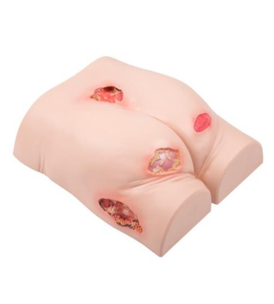 Cvičný model - simulátor pre ošetrovanie preležanín/dekubitov. Dekubity alebo preležaniny sú rany, ktoré vznikajú v miestach s oslabenou vrstvou tukového alebo svalového tkaniva dlhodobým pôsobením tlaku na povrch tela a trenia kože, dôsledkom čoho je nedostatočné zásobenie tkanív krvoiu a poškodenie tkanív. Vyskytuje sa u dlhodobo ležiacich pacientov. So simulátoromm dekubitov študenti ošetrovateľstva a medicíny sa môžu oboznámiť s odborným vyšetrením, popisom a vyhodnotením stavu, ošetrovaním rán a obväzovými technikami v rôznych štádiách dekubitu. Simulátor môže výrazne zlepšiť štandardy v rozpoznávaní a starostlivosti o dekubit u skutočných pacientov. Materiál simulátora je flexibilný a môže pomôcť poskytnúť realistický nácvik prebaľovania a nasadzovania obväzov, ktoré tvoria podstatnú časť ošetrovateľskej starostlivosti o rany. Zobrazené sú nasledujúce štádiá dekubitov: Dekubitus 1. stupňa (väčší trochanter – vpravo). Na väčšom trochanteri je možné vidieť dekubit 1. stupňa: je tam začervenanie, ale koža je neporušená. Dekubitus 2. stupňa (zadok – pravý). V oblasti krížovej kosti (os sacrum) Je viditeľná čiastočná strata kože: vonkajšia koža (epidermis) vykazuje známky poškodenia, ktoré zasahuje do dermis (corium). Zobrazené povrchové tlakové poškodenie sa môže prejaviť tvorbou pľuzgierov a kožných odrenín. Dekubitus 3. stupňa (zadok – vľavo). V ľavej dolnej časti zadku je možné vidieť dekubit 3. stupňa: rozpoznaný stratou všetkých vrstiev kože, s poškodením podkožia až po nekrózu. To sa pozná podľa čierneho sfarbenia v oblasti rany. Dekubitus 4. stupňa (väčší trochanter – vľavo, krížová kosť). Výrazný dekubitus 4. stupňa je prítomný na väčšom trochanteri (trochanter major) a na krížovej kosti (os sacrum): všetky vrstvy kože a svalová fascia sú zničené. Nekrotické oblasti boli označené čiernou farbou. Postihnuté sú aj svaly a oblasti kostí pod touto vrstvou. Toto poškodenie sa môže stať nekrotickým. Postihnuté môžu byť aj nosné štruktúry, ako sú šľachy, väzy alebo kĺbové štruktúry. Vidno aj pluzgiere, viac či menej rozšírené. Obsah dodávky: Trenažér dekubitov (simulácia zadku). Obal na prenášanie. Hmotnosť 2,13 kg. Rozmery 33 x 37,5 x 15 cm.