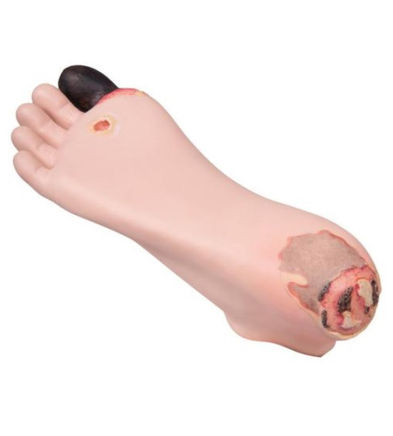 Cvičný model - simulátor vyšetrenia diabetesu na chodidle. Simulátor diabetickej nohy. Diabetes mellitus môže mať za následok defekty a dekubitové body v oblasti chodidla: gangrenózna zmena na palci pravej nohy už rozšírila zo zadnej časti chodidla do metatarzálnej, priehlavkovej časti. Na chodidle je viditeľný hlboký tropický vred (mal perforans). V oblasti päty je znázornený dekubit 3. stupňa (stratí sa kompletná kožná vrstva a podkožné tkanivo je poškodené až do nekrózy. Je to rozpoznateľné podľa čierneho sfarbenia v oblasti rany). Zvyšná časť nohy nie je súčasťou dodávky.