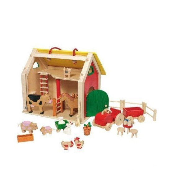 Stajňa, v ktorej bývajú domáce zvieratá: kravička, koník, 2 prasiatka, 2 sliepky, mačička. Obsahuje vybavenie potrebné pre každú farmu: traktor, krmivo pre zvieratá, fúrik, stolík a stoličky. Esteticky vyrobené prvky sú z lakovaného dreva. Zaistí deťom veľa hodín zábavy. Rozmery 30 x 20 x 27 cm.