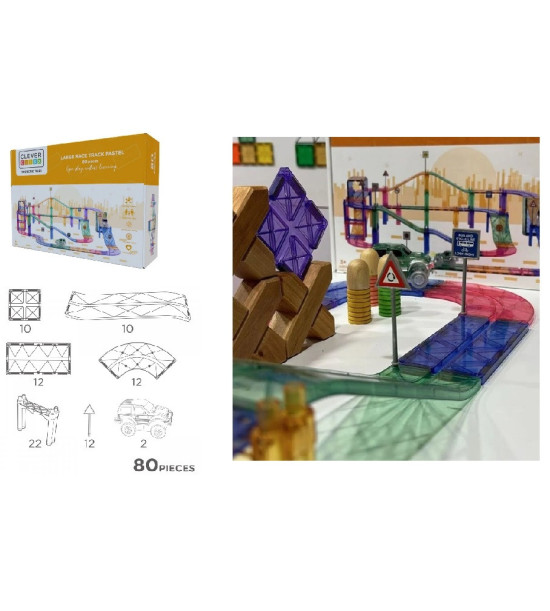 Táto súprava je navrhnutá tak, aby podporovala rozvoj motorických zručností, a je vhodná pre deti od 3 rokov. Je kompatibilná s inými stavebnicami Cleverclixx, čo rozširuje možnosti hry. Stavebnice značky Cleverclixx sú tiež kompatibilné so stavebnicami značiek Connetix aj Magna Tiles.Súprava obsahuje: 10 rámp; 12 zákrut; 12 dopravných značiek; 2 autá; 10 štvorcov; 22 stĺpov; 12 obdĺžnikov. V súprave je spolu 80 kusov dielikov.