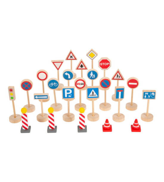 25 dielov obsahuje najdôležitejšie dopravné značky, semafor, cestné kužele a cestné značenie . Deti sa pri hraní s autíčkami môžu učiť pravidlá cestnej premávky. Výška značky cca 11cm, výška cestného kužeľa cca 3 cm. Vek 3+.