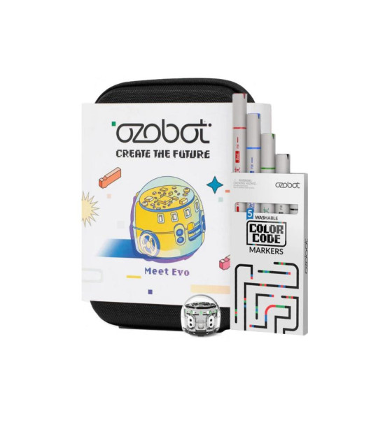 Funkcie a vlastnosti: Vstavané senzory, diódy a autonómne správanie, výdrž batérie približne 60 minút, komunikácia cez Bluetooth, zvuk a farebné LED diódy, kompatibilita s dotykovou obrazovkou aj papierom, podpora platformy OzoBlockly, vhodný na hry, programovanie úloh a tvorbu dráh. Využitie vo vzdelávaní: Rozvoj matematického a logického myslenia, základy informatiky, programovania a robotiky, podpora spolupráce, kreativity a riešenia problémov, vhodné aj pre žiakov so ŠVVP. Obsah balenia: 1× robot Ozobot Evo, 1× sada aktivít, 5× zmývateľná farebná fixa, 1× prenosné puzdro na zips.