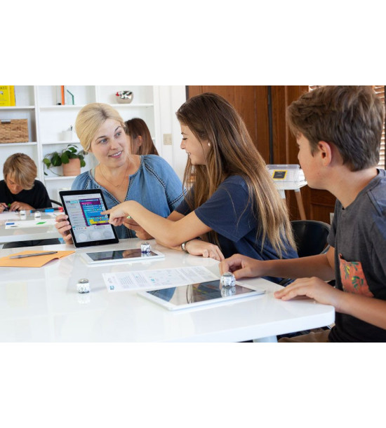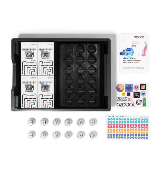 Deti čoskoro zistia, že neposedný Evo je tiež pre každú srandu! Získa si ich okrem iného svojim smiešnym džavotaním a cool pohyby. Učitelia sa zas budú môcť oprieť o fantastickú Ozobotia komunitu, ktorá zdieľa svoje nápady a plány. Využiť môžu obsah lekcií dostupných v online knižnici a svoje vlastné znalosti si rozšíriť vďaka pravidelným webinárom.Táto sada pre školy a záujmové krúžky je vybavená všetkým, čo potrebujú veľké tímy, aby sa do zábavného kódovania mohli hneď pustiť. Popri 12 Ozobotoch Evo v nej nájdete aj súbor aktivít, ktoré vám pomôžu do tajov programovania hladko preniknúť. Nechýba ani set 12 umývateľných fixiek, ktoré deťom uľahčia do kreslenia farebných kódov a vlastných spletitých dráh. Radosť im určite urobí aj množstvo farebných samolepiek. Novinkou je potom nabíjacia matrica, ktorá sa postará aj o automatickú aktualizáciu softvéru.