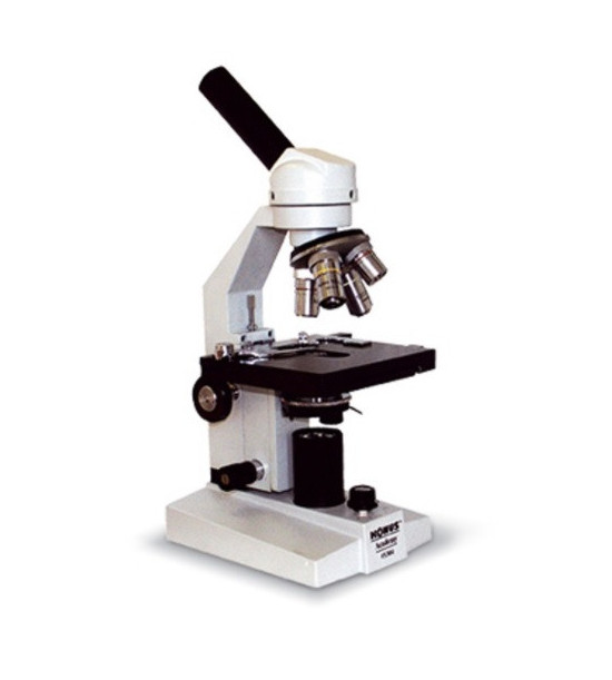 Monokulárny profesionálny mikroskop s otočnou okulárovou hlavou. Okulár s 10x zväčšením a ohniskom 160mm a štyrmi achromatickými objektívmi: 4x, 10x, 40x a 100x. Hrubé a jemné ostrenie a mikroposuv preparátu na pozorovacej platforme. Spodné osvetlenie s reguláciou intenzity osvetlenia a irisovou clonou. Protiprachový kryt v balení.