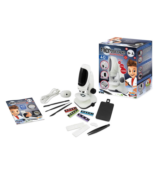 Digitálny mikroskop Buki MR700 je jedinečný svojou univerzálnosťou a hlavne schopnosťou spolupráce s modernými telefónmi a počítačmi. Mikroskop ponúka 3 hlavné spôsoby použitia, čo je za danú cenu jedinečné aj praktické riešenie. pracujem v 3 režimoch: 1. štandardný -pozorovoanie vzorky okom cez okulár; 2. digitálny - pozorovanie vzorky cez smartfón; 3 -pozorovanie vzorky v PC pomocou priloženej USB kamery. Navyše je možné použiť samostatne telo mikroskopu ako prenosný vreckový mikroskop. Ďalšou nespornou výhodou je spodné aj vrchné LED osvetlenie, čo umožňuje pozorovanie aj menších nepriesvitných vzoriek.Mikroskop ponúka zväčšenie 50x - 400x a je vhodný pre začiatočníkov i pokročilých vedátorov.K maximálnemu využitiu funkcií mikroskopu sa odporúča vlastniť chytrý telefón a / alebo počítač s USB vstupom a systémom Windows alebo MacOS.Vhodné pre deti od 8 rokov s dohľadom dospelej osoby. Nevhodné pre deti do 3 rokov, obsahuje malé dieliky a hrozí udusenie.