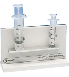 Model hydraulického lisu. Tento model hydraulického lisu možno použiť na skúmanie vzťahu medzi tlakom a objemom. Súprava pozostáva z dvoch striekačiek s objemom 2 a 20 ml. a je pripojený krátkou PVC hadicou. Model pozostáva z dvoch sklenených striekačiek, ktoré sú spojené kusom hadice. Striekačky sú upevnené v akrylovom držiaku vybavenom oceľovou tyčkou, ktorá umožňuje upevnenie modelu na stojan (stojan nie je súčasť dodávky).