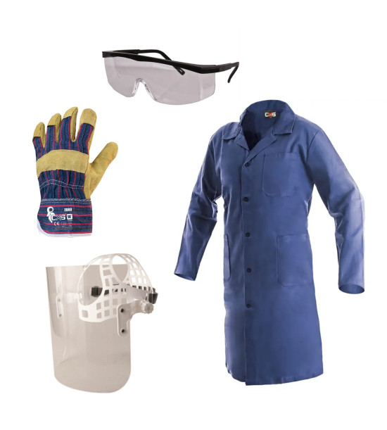 Súbor ochranných prostriedkov pre prácu v dielni pre učiteľa. Súbor obsahuje tieto ochranné prostriedky spĺňajúce nasledovné požiadavky: 1 ks ochranných okuliarov, spĺňajúcich požiadavku na prácu v dielni, 1ks pracovný plášť modrý s dlhým rukávom, tromi vreckami a vzadu s nastaviteľným opaskom, veľkosť L, 1 pár ochranných rukavíc, dielenských, latexová dlaň, 1ks ochranný štít dielenský.