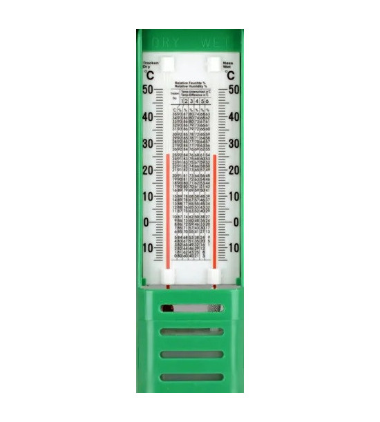 Psychrometer na meranie relatívnej vlhkosti a teploty. Prístroj sa skladá z dvoch teplomerov s červenou kvapalinou, z ktorých jeden má vlhkú vložku umiestnenú v malej nádobe s vodou. Rozdiel teplôt medzi suchým (konvenčný teplomer) a mokrým teplomerom (obaleným a namočeným vo vode) umožňuje určiť vlhkosť pomocou tabuľky na prednej strane (odčítanie relatívnej vlhkosti z teplotného rozdielu zaznamenaného suchým a vlhkým teplomerom). Psychrometer pokrýva rozsah merania od 0 do 100 % vlhkosti a nevyžaduje žiadne nastavovanie, vďaka čomu je vhodný na stacionárne použitie aj na prácu v teréne. Psychrometer musí byť zavesený mimo prievanu. Vyžaduje naplnenie demineralizovanou vodou cca každé 3 mesiace. Rozsah teplôt: od -10°C po 50°C, dielik 1°C. Dĺžka 300mm.