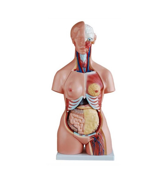 Bezpohlavný trup je rozložiteľný na 21 častí: trup, ženská poprsnica, hlava, očná buľva, mozog, chrbticové nervy chrbtice , pľúca (2 časti), srdce (2 časti), pečeň, obličky, žalúdok, vnútornosti (2 časti), mužské genitálie (2 časti), ženské genitálie s plodom (3 časti), časť bez genitálii. Vyrobené z PVC. Namontovaný na podstavci. Výška: 85 cm.