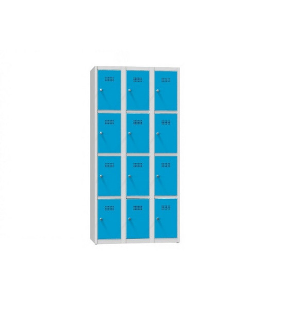 Kovová šatňová skriňa 4-box, vyrobená z oceľového plechu, dvierka vybavené výstužou. Perforácia na vrchnej aj spodnej časti dvierok umožňuje ventiláciu skrinky. Povrchová úprava skrine práškovou vypaľovanou farbou, korpus v odtieni RAL 7035 sivá svetlá, dvierka výber zo vzorkovníka. Vybavenie každej bunky zahŕňa cylindrický zámok, alebo uzáver na visiaci zámok. Spôsob uzamykania je potrebné zvoliť - cylindrickým zámkom s 2 kľúčmi, alebo uzáverom na visiaci zámok (visiaci zámok nie je súčasťou skrinky). K cylindrickým zámkom je možné doobjednať generálny (univerzálny) kľúč. Pre uľahčenie udržiavania čistoty je možné do každej bunky dodať plastovú vaničku pod obuv.