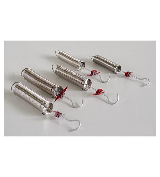 Sada 5 oceľových pružín so značkami (s rôznými priemermi a tuhosťami). Sada obsahuje 5 pružín, ktoré je možné použiť v rôznych rozsahoch merania, pružiny je možné zaťažiť silou až 0,5N / 1N / 2N / 3N / 5N. So závažím s hmotnosťou 100 gramov sa pružiny natiahnu o 370 mm, 160 mm, 90 mm, 60 mm a 40 mm. Materiál: oceľový poniklovaný drôt. Pružiny sú základným meracím nástrojom v oblasti skúmania vzťahu medzi silou a predĺžením a nevyhnutným doplnkom pre fyzikálne laboratóriá. Každá pružina má na jednom konci uzavreté očko a na druhom konci háčik na zavesenie závaží.