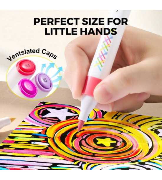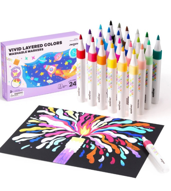 Maľovanie, ktoré rozvíja fantáziu aj zručnosť. Praktické balenie s 24 sýtymi fixkami v živých farbách pre deti od 3 rokov. Možnosť vrstvenia farieb – každá kresba je originálna. Rozvíja jemnú motoriku, trpezlivosť a vizuálne vnímanie. Podporuje kreativitu a zmysel pre farby pri experimentoch s odtieňmi. Úumývateľný atrament – jednoduché čistenie rúk a povrchov netoxické zloženie, bezpečné aj pre mladšie deti.