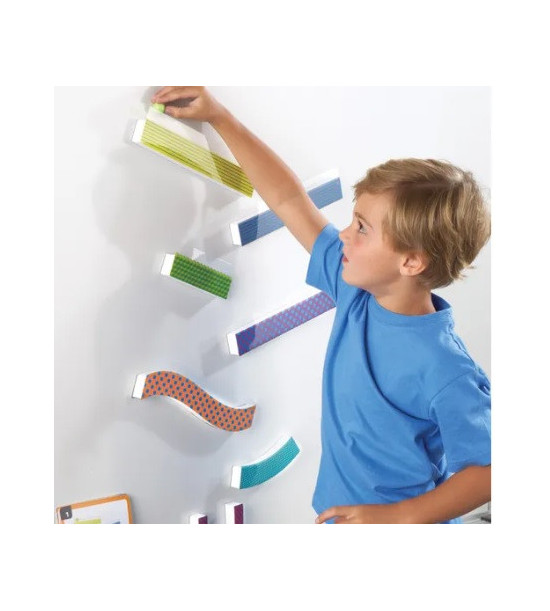 Guľôčková STEM pádová dráha na magnetickú tabuľu. Usporiadajte magnetické dieliky, na najvrchnejší dielik položte a pustite guľôčku a zistite, či vaša dráha funguje a či guľôčka doputuje až do cieľa. Sada obsahuje: - 14 magnetických penových dielcov a 1 magnetický penový cieľ - 4 hracie guľôčky - 10 obojstranných kartičiek s aktivitami. Najdlhší diel má 25cm. Pre deti od 5 rokov.