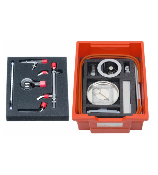 Pomocou setu sa dajú bezpečne vykonať všetky obvykle prevádzané destilačné procesy. Študenti môžu sledovať chladenie vody a oddeľovanie kvapalín na základe ich odlišných teplôt varu. SVS systém pozostáva zo skrutkových spojov, ktoré pozostávajú zo skrutkovacieho uzáveru, silikónového tesnenia a PTFE manžety. Tak sa zabezpečí jednoduchšie ovládanie a zaistí bezpečnosť a odolnosť voči priesaku spojmi medzi jednotlivými časťami. V prepravke s výstužou a krytom. Rozmery balíka: 312 x 427 x 150mm. Obsahuje: frakčnú banku 100ml, kadičku 100ml, destilačnú hlavu, adaptér, chladič podľa Liebiga 150mm, teplomer od -10 do +110°C, stojan so svorkami, svorky 2x, tyč stojana 330mm 2x, svorkový držiak 2x, upevňovací krúžok, trojnožku, držiace klipy, keramickú drôtenú sieťku, kahan, ohňuvzdornú podložku, kadičku 100ml, gumené rúrky. Obsah materiálu pre jednu skupinu študentov.