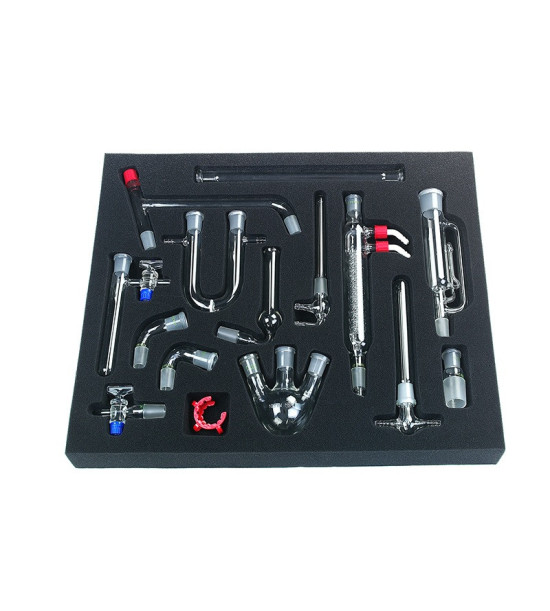 Táto prístrojová súprava obsahuje doplnkové vybavenie pre súpravy 1 + 2 (11900051C, 1190006C) pre špeciálnu prácu. * 1 banka s okrúhlym dnom s trojitým hrdlom, 100ml, * 1 destilačný mostík (éterový mostík), * 1 extrakčné prístroje Soxhlet, * 1 prechodový kus, * 1 spätný chladič Dimroth, * 1 sušiaca rúrka, zahnutá, * 1 potrubné koleno, 90°, * 1 potrubné koleno, 75°, * 1 skúmavka, Supremax, * 1 skúmavka s bočným nástavcom, * 1 vložka premývačky plynu, * 1 U rúrka s 2 bočnými nástavcami, * 1 prstový chladič, * 1 odsávací diel s kohútikom, * 1 zabrúsená úchytka NS 29/32.